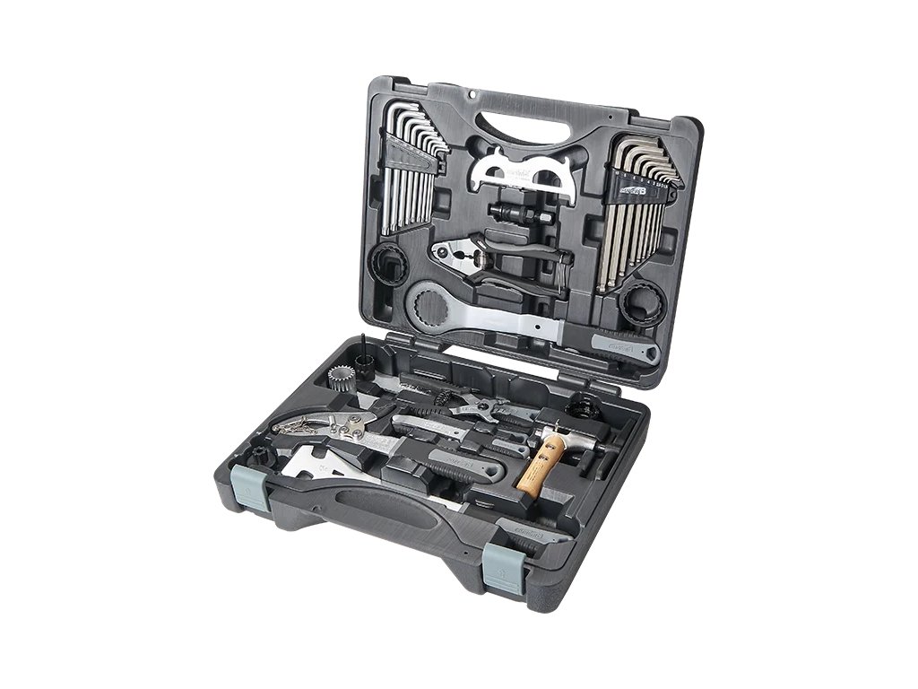 - 1x univerzální nýtovač řetězu pro řetězy 3/32" až 3/16" a 5 až 12 rychlostí - 1x klíč na středovou osu Shimano® Hollowtech II, Truvativ® GXP, FSA® MegaExo, Campagnolo® Ultra-TorqueTM, TOKEN® a podobné středové osy s 16 drážkami- 1x 2v1 universální stahovák na kliky Shimano® Octalink a ISIS Drive a čtyřhran- 1x klíč na kazety s vodícím kolíkem pro kazety Shimano®, SunRace®, SRAM®, Chris King®, SunTour® a podobné- 1x klíč na středové složení s vodícím kolíkem pro Shimano®, ISIS Drive® s drážkou 20 zubů, FSA®, Race Face® Truvativ® a TOKEN®- 1x 2v1 kleště na spojování a rozpojování rychlospojek řetězu- 1x přepravní kufřík
