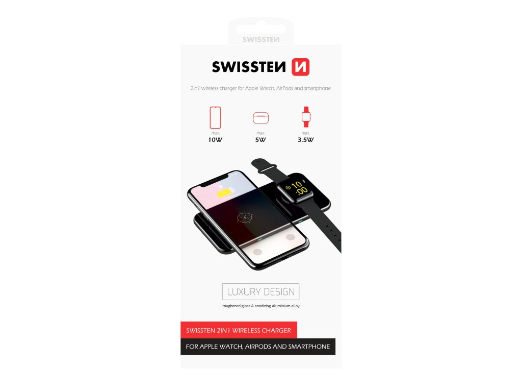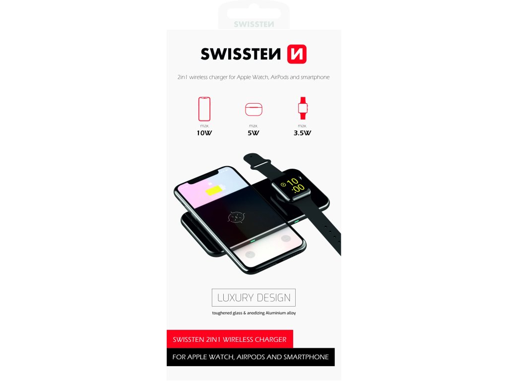 Ultratenká bezdrátová nabíječka SWISSTEN 2v1 pro nabíjení smartphonů, AirPods nebo Apple Watch. Baleno v blistru SWISSTEN