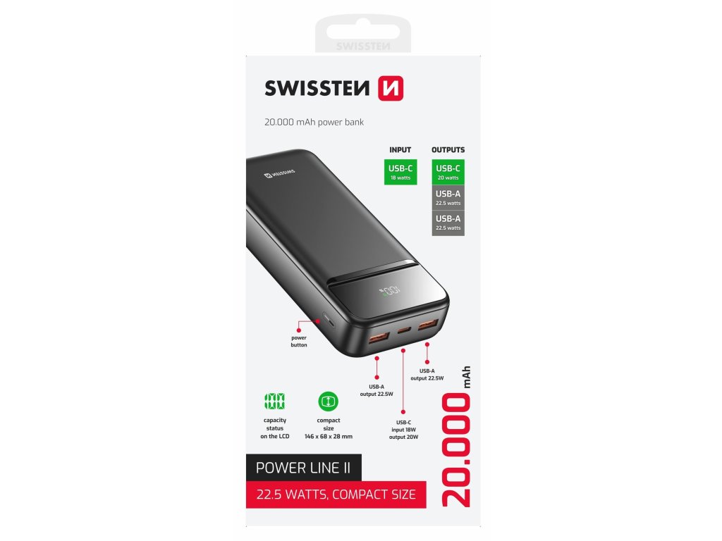 Powerbanka Swissten Power Line II 20.000 mAh, Max. výkon 22,5 Wattů, Porty výstupu: 2x USB-A / 1x USB-C, Váha: 421 gramů, Typ baterie: Li-polymer, Malé rozměry: (14,6 x 6,8 x 2,8 cm), Dobíjecí kabel v balení.