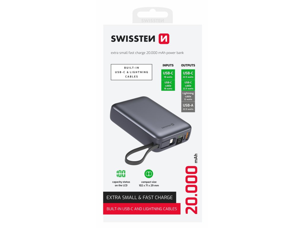 Powerbanka Swissten 20000 mAh s integrovanými kabely USB-C + Lightning, Výstupní porty: USB-A + USB-C, Max. výkon 22.5W, Váha: 323 g, Typ baterie: Li-Polymer, Malé rozměry: (10.2 x 7.1 x 2.9 cm).