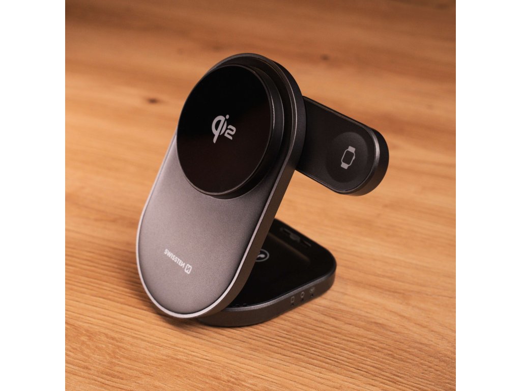 Swissten nabíječka MagBase 3v1, Qi2 nabíjení až 15W, Pro iPhone, Apple Watch a AirPods, Skládací tělo, LED indikátory, USB-C vstup 27W, Rozměry 72 × 25 × 123 mm, Váha 163 g.