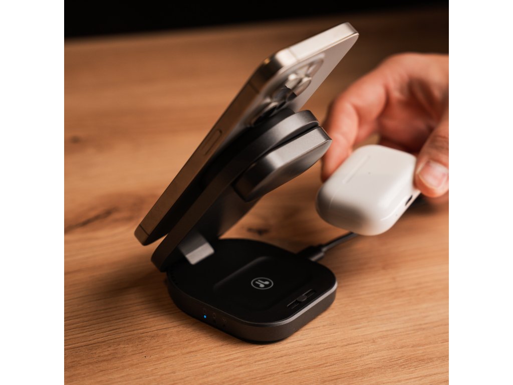 Druhá a třetí zóna jsou určeny pro Apple Watch (až 2.5 W) a bezdrátová sluchátka jako AirPods nebo Galaxy Buds (až 5 W). Každá zóna má samostatný LED indikátor pro přehled o stavu nabíjení.