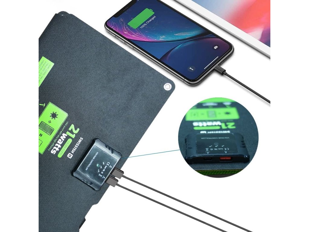 SWISSTEW solární panel s dobíjecím výkonem USB-C 15W a USB-A 12W.