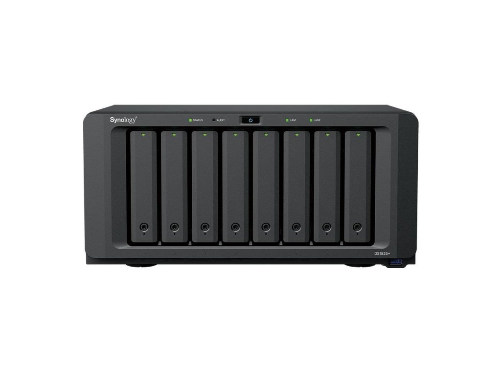Výkonné NAS Synology DS1825+ s 8 šachtami, 2.5GbE, NVMe cache a až 360TB. Kompatibilní pouze s disky Synology.