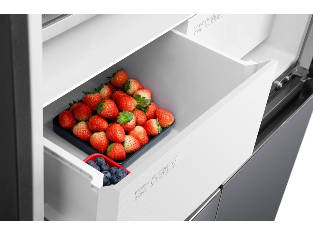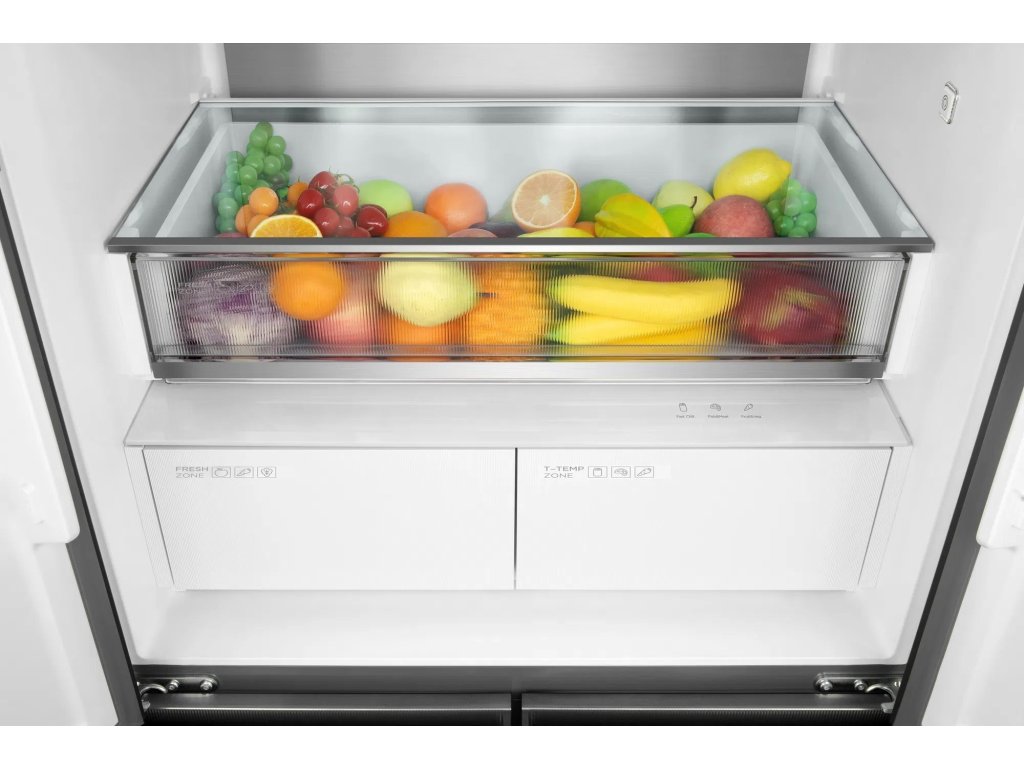 Přihrádka T-temp umožňuje snadné nastavení tří různých teplot jediným dotykem na elektronickém panelu. Tato funkce prodlužuje čerstvost a zachovává texturu různých potravin tím, že vytváří ideální podmínky přímo ve vaší lednici. Je obzvlášť užitečná pro rodiny, které potřebují skladovat větší množství různorodých potravin. Teploty jsou nastaveny takto: -3°C pro rychlé chlazení, -1°C pro ryby a maso a 4°C pro ovoce a zeleninu.