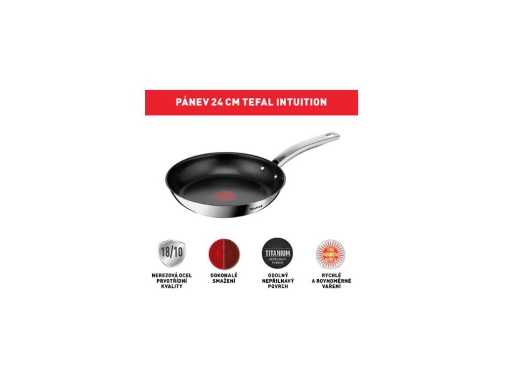S nerezovou pánví Tefal Intuition B8170444 pro vás bude smažení a restování pokrmů hračka. Pánev disponuje průměrem 24 cm a je opatřena nepřilnavým povrchem Titanium. Díky indikátoru teploty snadno poznáte, že je již rozpálena na správnou teplotu. Pánev lze použít na všechny druhy ohřevu včetně indukce. Manipulaci vám usnadní robustní rukojeť a pánev se po použití snadno čistí.