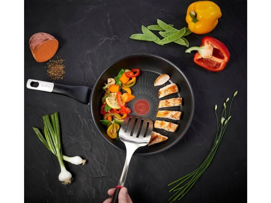 Milujete smažené pokrmy a rádi si je připravujete v pohodlí domova? Skvělým pomocníkem v každodenním vaření se vám stane pánev Tefal Unlimited G2550672. Je upravena speciálním odolným a nepřilnavým povrchem TITANIUM Anti-Scratch. Ten v sobě slučuje praktičnost nepřilnavého povrchu a mimořádnou odolnost proti poškrábání, která ustojí i kovové náčiní. Díky technologii THERMO-SIGNAL bezpečně poznáte ten správný moment, kdy je pánev ideálně nahřátá a připravená pro restování.