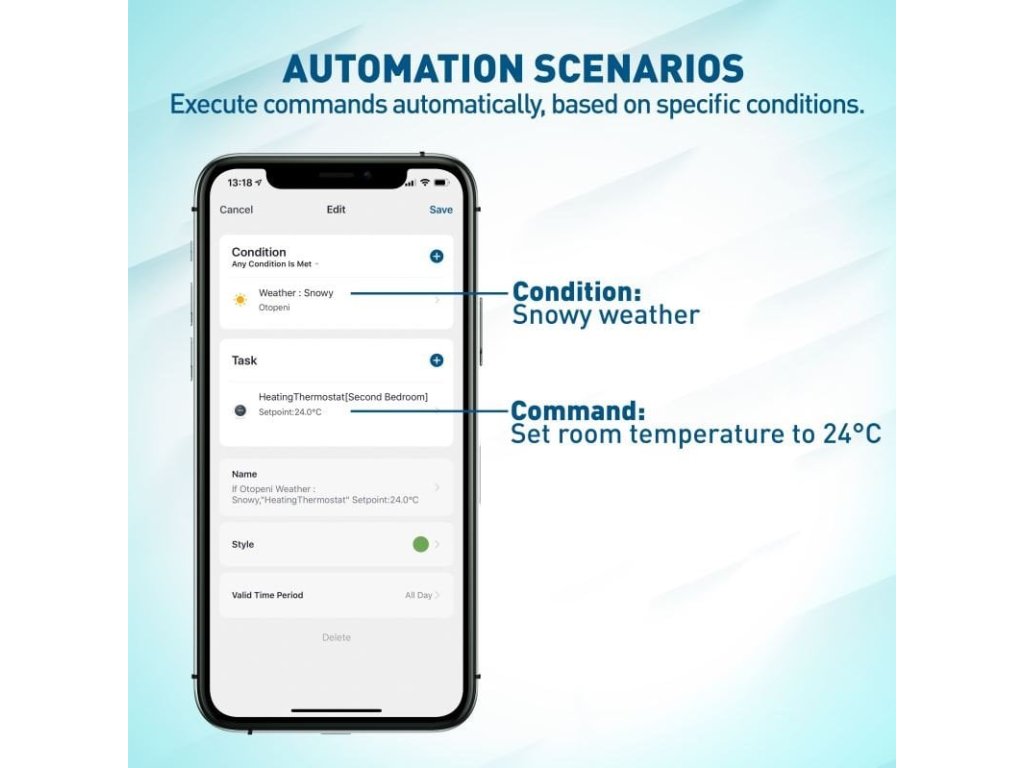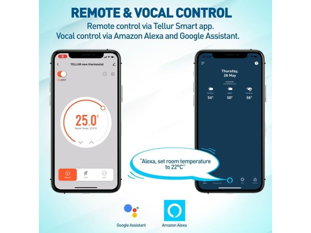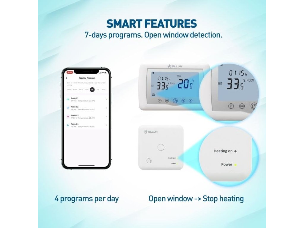 Chytrý termostat sloužící ke kontrole vytápění v domě, WiFi, kompatibilní s Google Assistant a Amazon Alexa, týdenní programování, ovládání přes aplikaci na Android a iOS