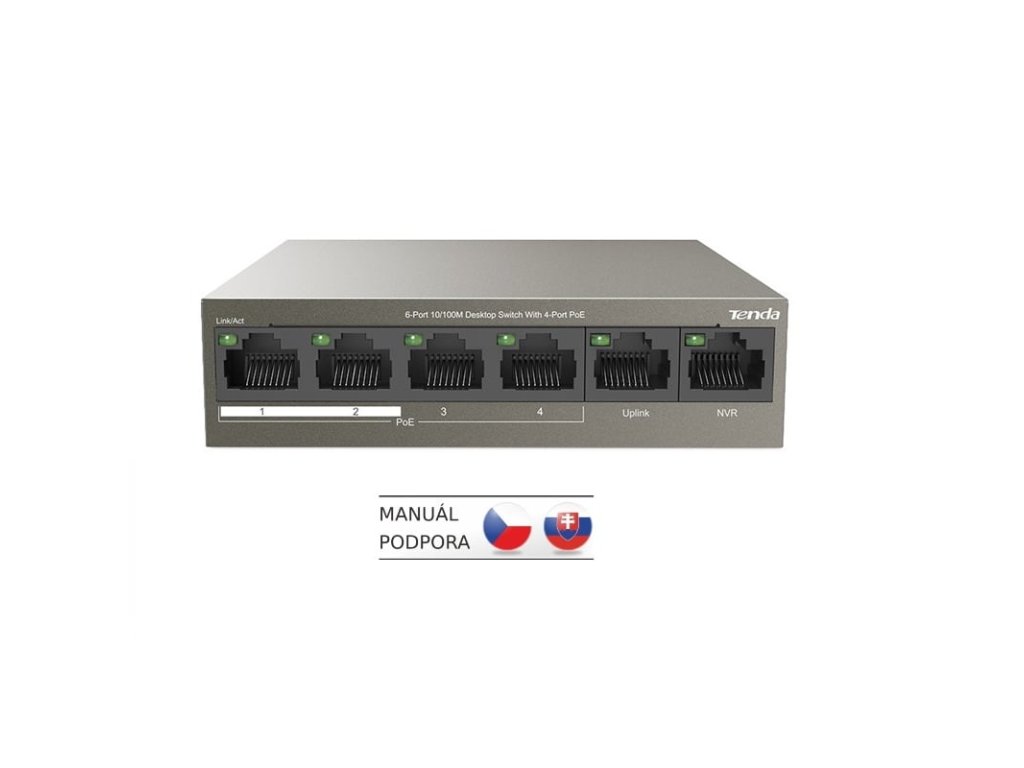 Porty: 6x 10/100Mbps RJ45 auto-negace, Port1 až Port4 podporuje IEEE802.3 at/af PoE standart
