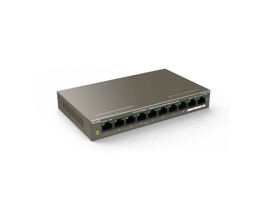 Tenda TEF1110P-8-102W přepíná data pomocí 10ti portů RJ45, 8 portů 10/100 Mb/s podporuje PoE802.3af/at + 2 porty 10/100/1000 Mb/s pro Uplink. Switch má ochranu proti přepětí 6kV. Podpora přepojování uzlů v módu Store-and-Forward. Full-duplex kontrola toku 802.3x, half-duplex kontrola toku v režimu Back-Pressure.