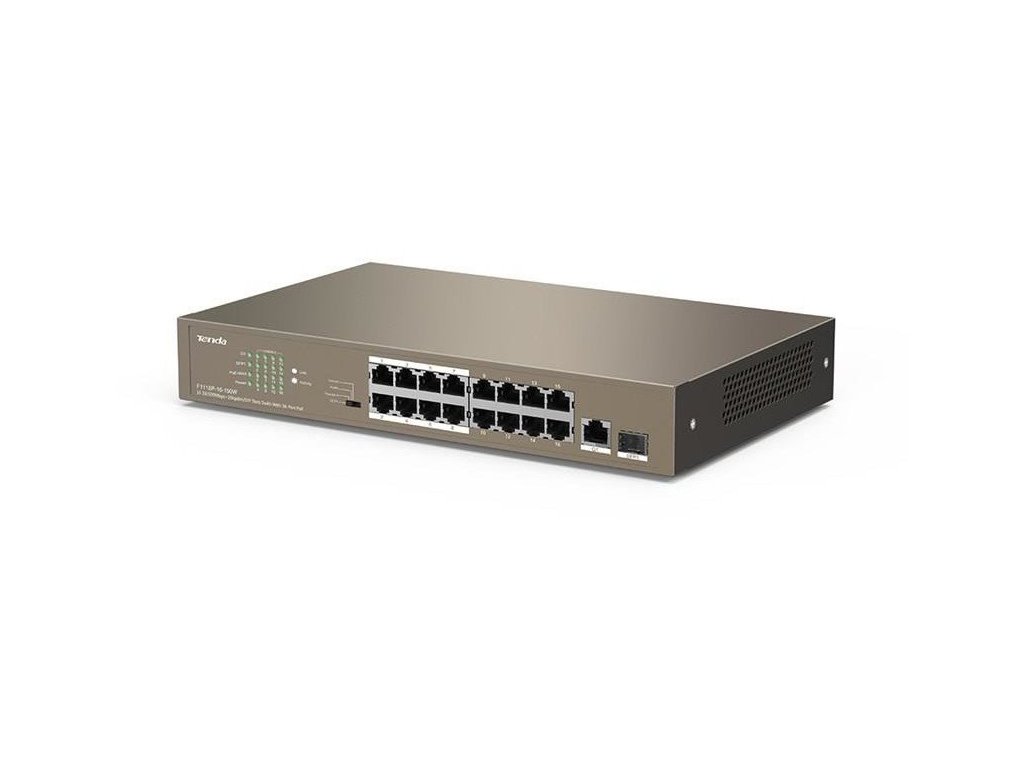 Tenda TEF1118P-16-150W je 17ti portový PoE switch s napájením PoE af/at. 16 portů 10/100 Mb/s s PoE 802.3af/PoE 802.3at (celkem 135 W) + 1xCombo RJ45/SFP 100/1000 Mb/s pro Uplink. Rackmount 19", velikost switche 13". Ochrana proti přepětí 6 kV.