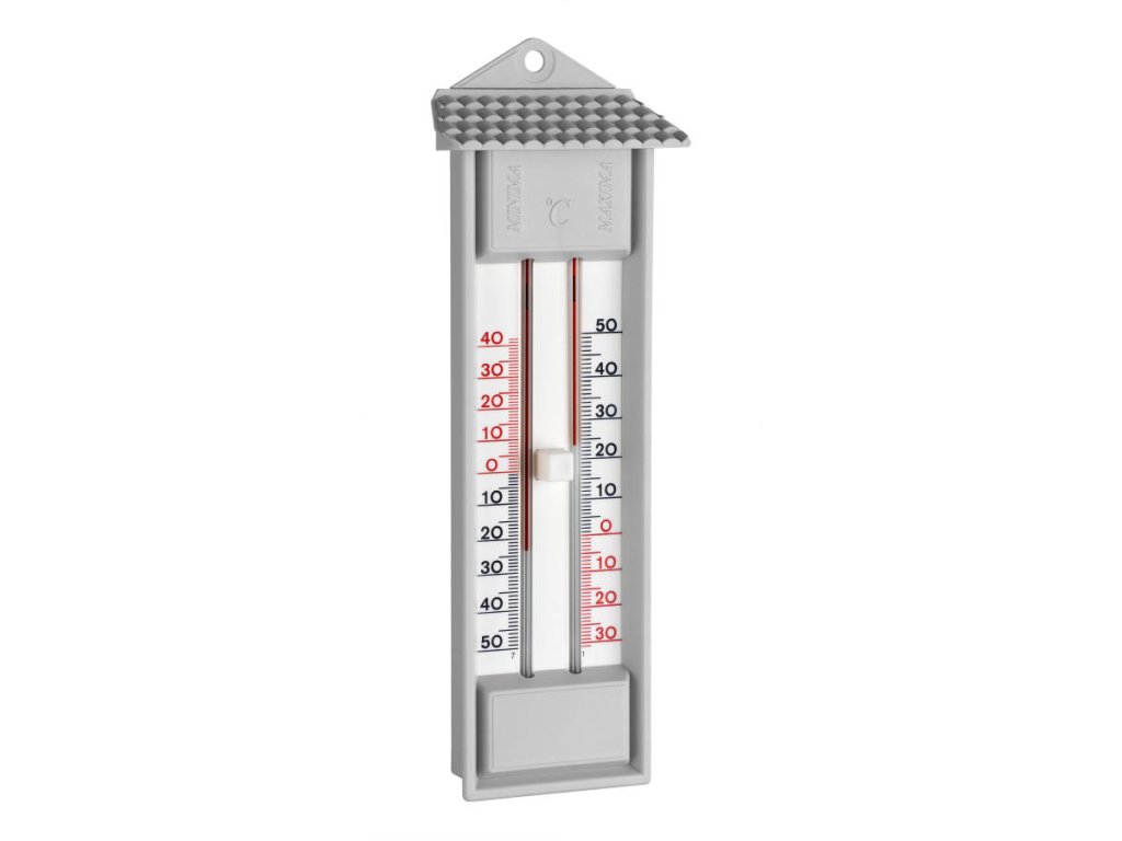 Kapalinový teploměr s označením max-min teploty. Mezi kapilárami je tlačítko, které ruší označení naměřených teplot. Vyrobeno z šedého plastu. Kapilára bez rtuti.