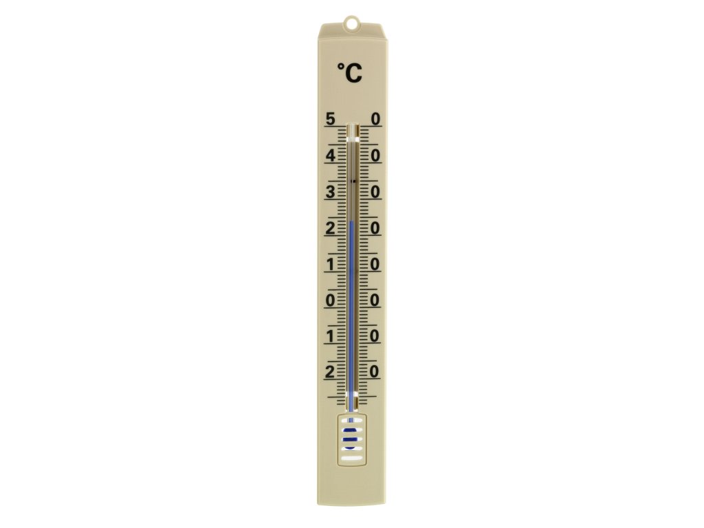 Plastový závěsný kapalinový teploměr hnědé barvy je vhodný jak pro měření teploty venku, tak i v pokoji.