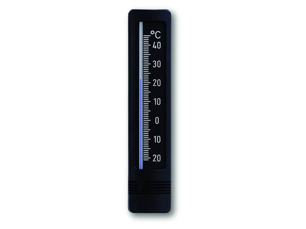 Tento černý plastový teploměr se stříbrnou stupnicí je odolný proti povětrnostním vlivům a lze jej použít uvnitř i venku.
