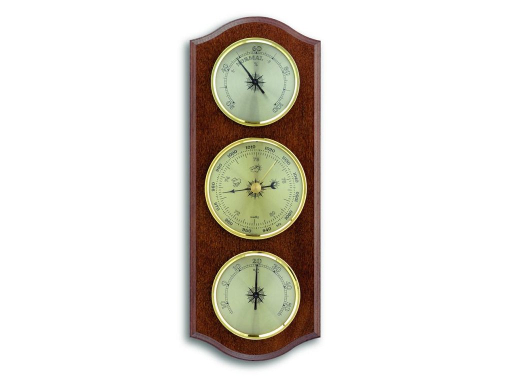 Meteostanice obsahuje barometr, vlhkoměr a teploměr - přístroje jsou o průměru 70 mm (teploměr, vlhkoměr) a 81 mm (barometr). Podložka je buková mořena do odstínu ořechu.