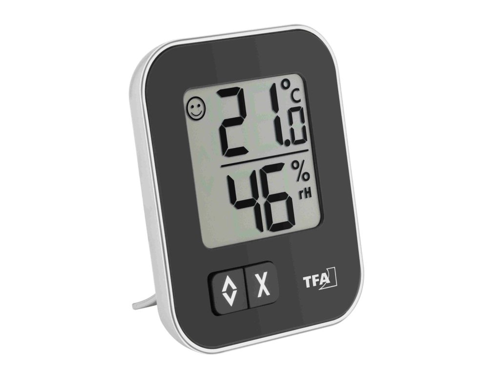 Digitální teploměr s vlhkoměrem TFA 30.5026.01 MOXX měří pokojovou teplotu v rozsahu 0 °C až +50 °C a pokojovou vlhkost v rozsahu 20-99 %. Přístroj si také pamatuje naměřené min/max hodnoty. Na displeji je také symbol komfortu - smajlík zobrazuje správné klima v místnosti (40% - 60%). Teploměr je možno zavěsit na stěnu, nebo opřít o výklopný stojánek.