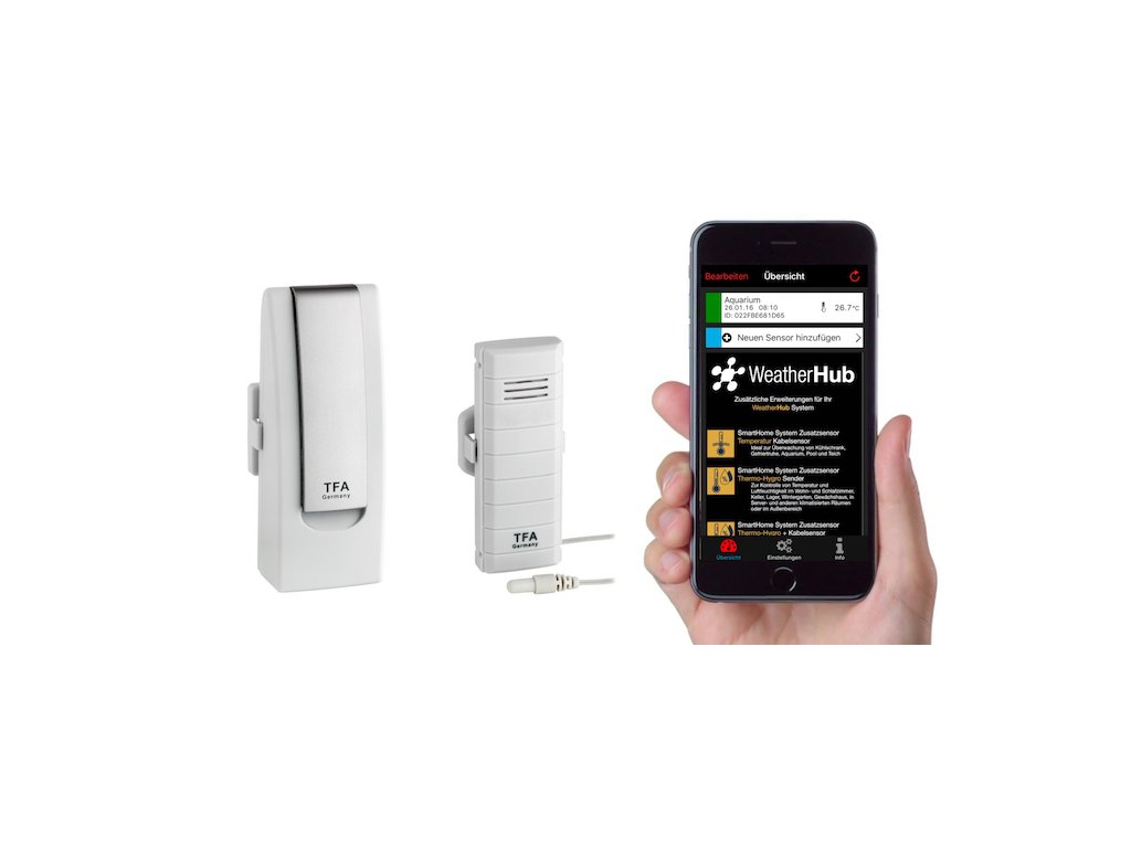TFA 31.4011.02 WEATHERHUB – set č. 11 – součástí setu je brána, čidlo teploty s kabelem – startovní sada vhodná pro všechny, kdo mají doma terária, akvária či chtějí monitorovat teplotu v mrazáku, lednici atd.