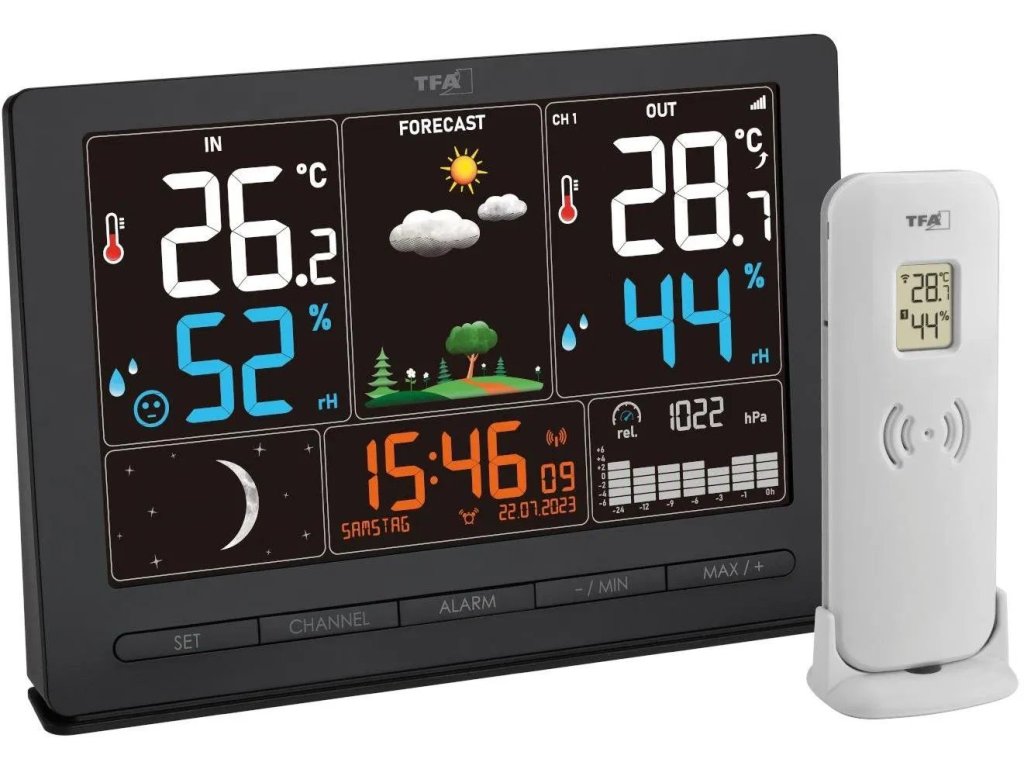 Jeden pohled na meteorologickou stanici TFA 35.1118.01 SEASON 2 a hned budete v obraze. Jasně čitelný barevný displej s možnosti nastavení jasu a dostatečně velkým fontem písma je hlavním znakem této meteostanice, která kromě venkovní teploty a vlhkosti měří též vnitřní teplotu a vlhkost, atmosférický tlak. Meteostanice dále zobrazuje rádiem řízený čas, datum a název dne v týdnu v jednom ze 6 světových jazyků. Nechybí symbolová předpověď počasí ani např. ikona měsíční fáze. Základnu lze zavěsit či postavit na podložku.