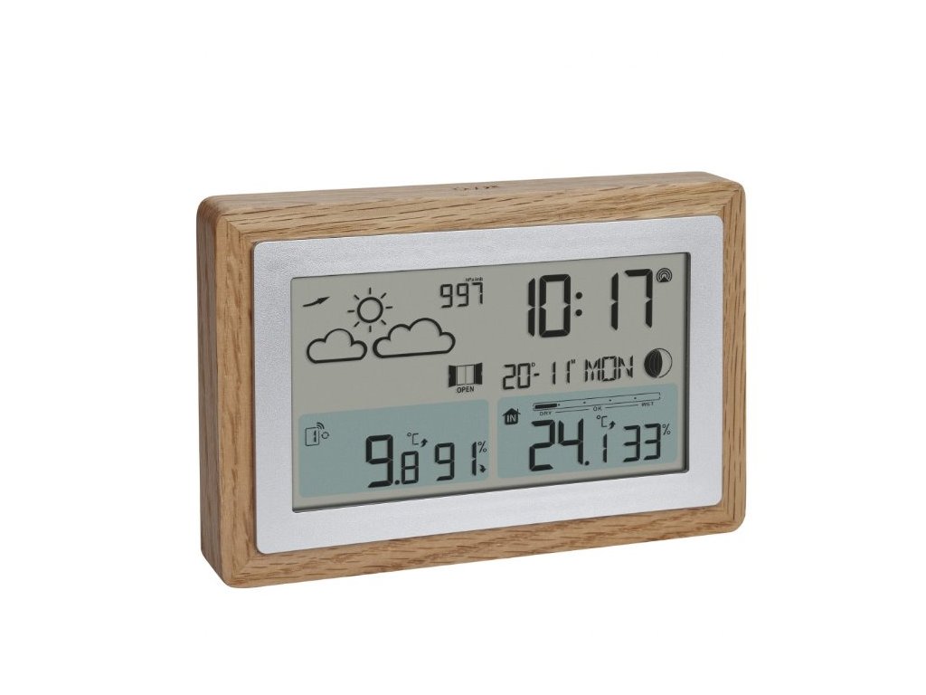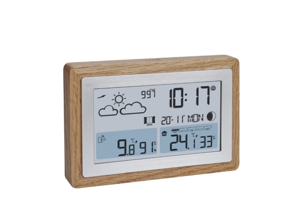 Bezdrátová meteostanice OAK je ideální kombinací pro každého, kdo chce mít k dispozici mnoho informací najednou. Umístěte bezdrátovou meteostanici OAK na viditelné místo ve své domácnosti. Rám z pravého dubového dřeva umožňuje snadné začlenění zařízení do útulného obytného prostředí. Venkovní údaje přicházejí prostřednictvím až 3 bezdrátových vysílačů a rádia. Potřebné napájení zajišťuje síťový adaptér.