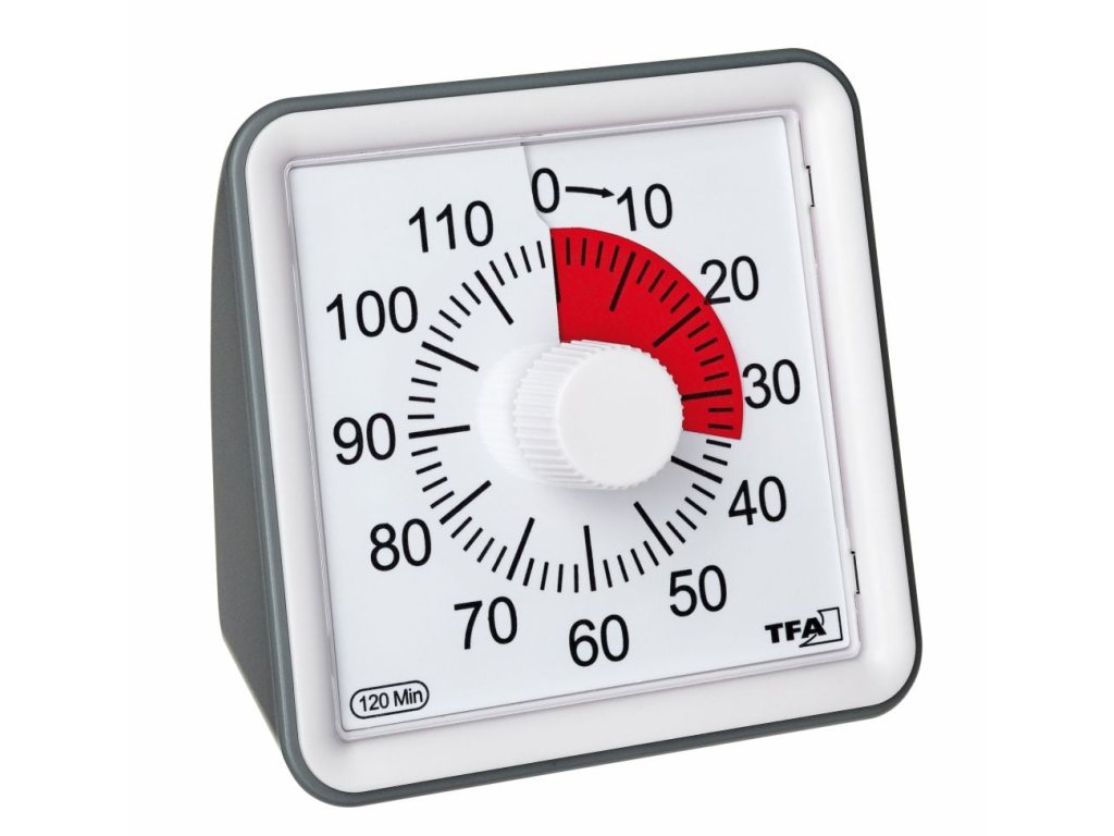 Minutka s barevnou indikací zbývajícího času. Jednoduché nastavení pomocí otočného kolečka, tichý chod, alarm zvoní 5 nebo 60 vteřin s možností dvou úrovní hlasitosti.