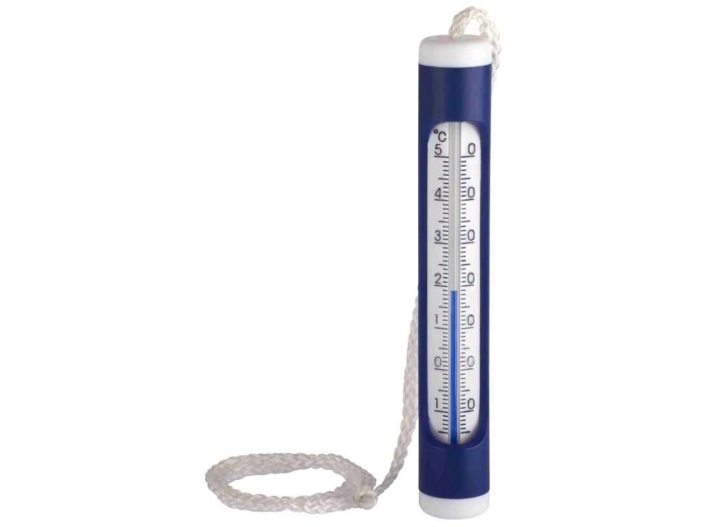 Teploměr bazénový měřící v rozsahu -15 až +50 stupňů Celsia. Provedení bílo-modrý plast, teploměr plave na vodě, dobře čitelný, možno uchytit pomocí malého provázku.