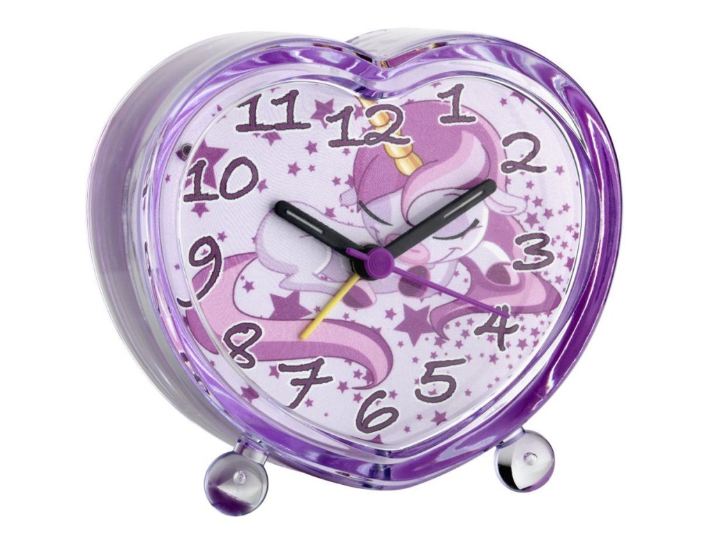Dětský elektronický budík s analogovým displejem ve tvaru srdce. Je vybaven podsvícením.