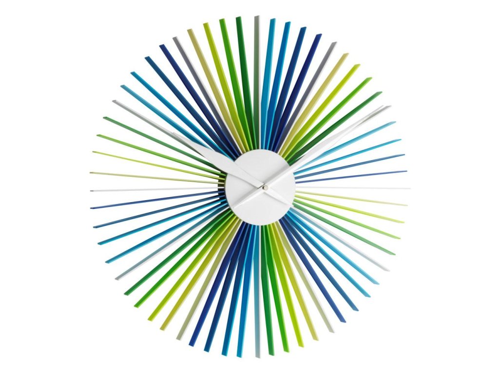 Velké nástěnné hodiny v neobyčejném moderním designu. Kovové ručičky, vějířovitý ciferník z akrylátových tyček. Ideální do větších místností, čekáren, vstupních hal atd.
