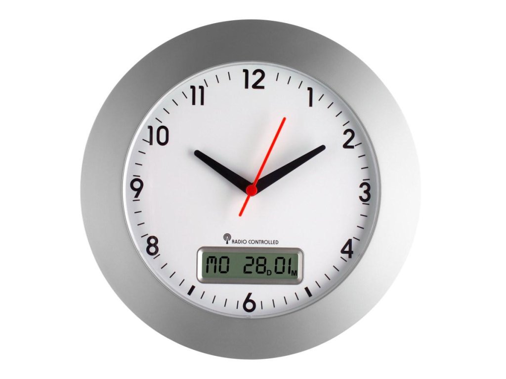 Nástěnné analogové hodiny řízené DCF signálem se snadno čitelným ciferníkem a LCD displejem pro zobrazení zkratky dne a aktuálního data