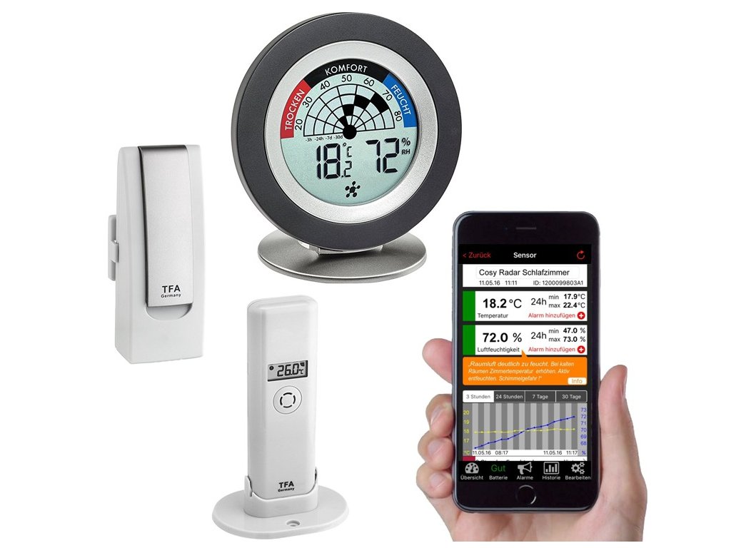 Bezdrátový monitoring vnitřní/venkovní teploty a vlhkosti odkudkoliv a kdykoliv, možnost dokoupení a připojení celkem 50 senzorů (teplota, vlhkost, vítr, srážky, bezénový senzor, dveřní/okenní kontakty), bezplatná aplikace pro iOS a Android