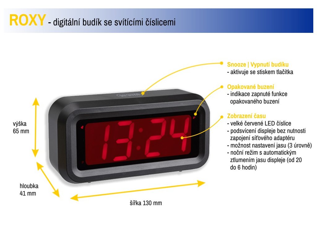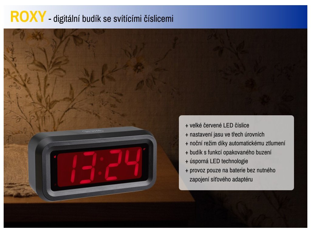 Digitální budík – velké červené LED číslice s možností nastavení jasu (3 úrovně) a funkcí automatického ztlumení displeje, budík s funkcí opakovaného buzení, stálé podsvícení displeje bez síťového adaptéru díky úsporné LED technologii
