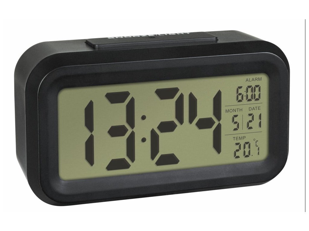 Digitální budík s velkou LCD obrazovkou a s funkcí zobrazení data a vnitřní teploty. Funkce opakovaného buzení (Snooze), zesilující a zrychlující vyzvánění buzení, možnost podsvětlení displeje (5 sekund), funkce měření vnitřní teploty, nastavení zobrazení