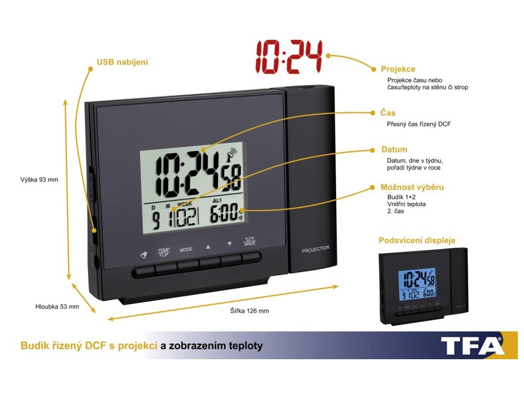 Digitální budík - vysoce přesný rádiově řízený čas, projekce času nebo času/teploty na strop nebo stěnu (trvalá pouze při provozu na adaptér), zobrazení dne, dne v týdnu, týdne v roce a duálního času, budík se dvěma budícími časy a možností odložení