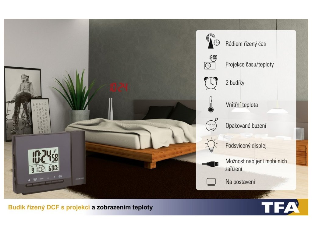 TFA digitální budík s rádiově řízeným časem a projekcí 60.5013.01 - černý
