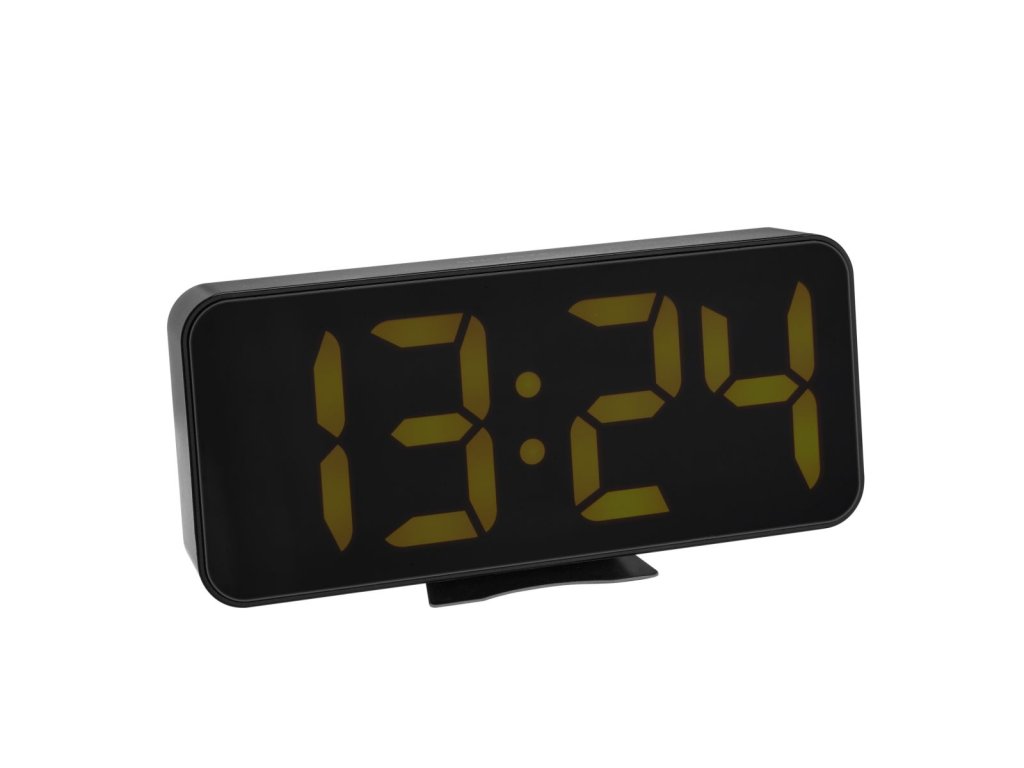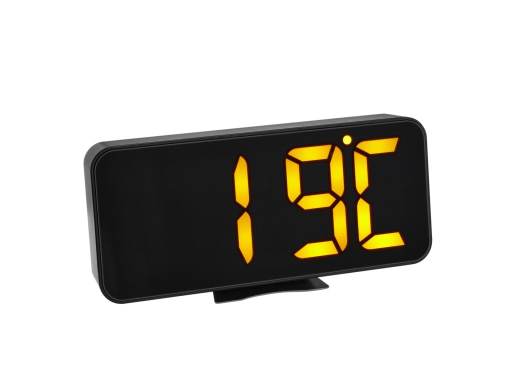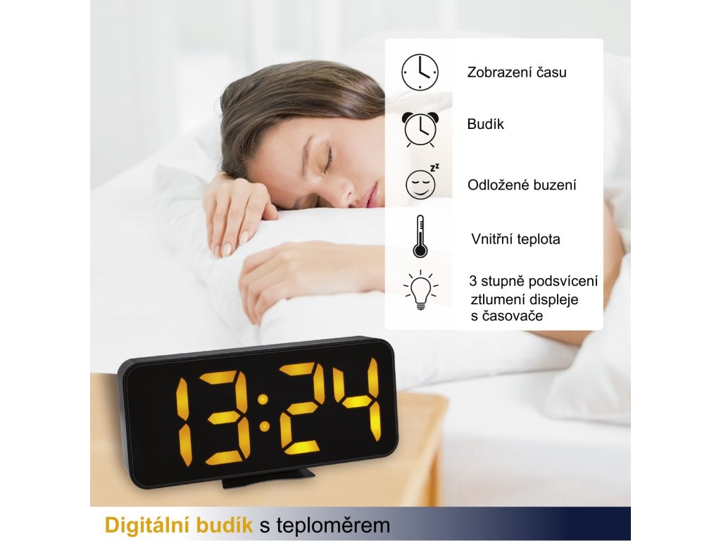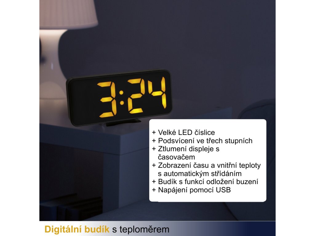 Digitální budík s teploměrem a velkými LED číslicemi, náladové osvětlení s 5 světelnými režimy, 5 úrovní jasu, jemné probuzení, funkce odložení buzení s nastavitelnou dobou, zobrazení času, data a dne v týdnu, vnitřní teplota a vlhkost, USB port (1 A).