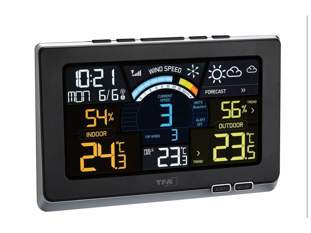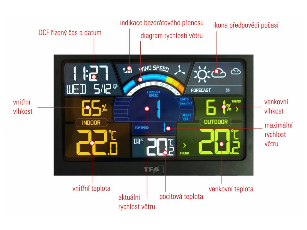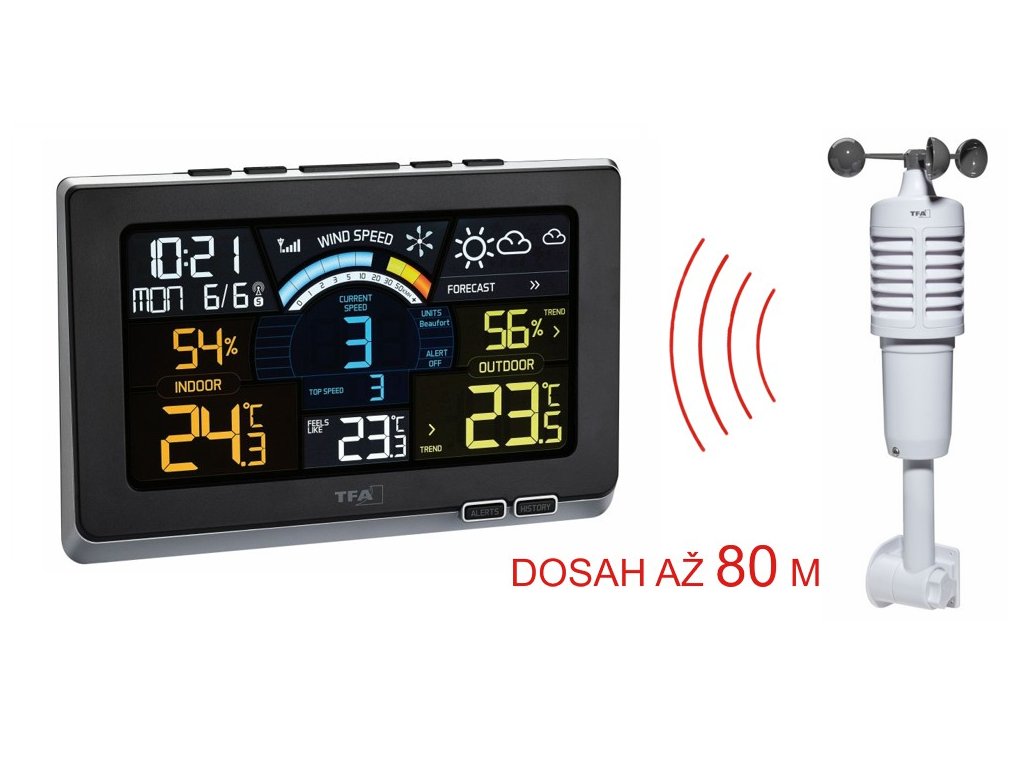 Digitální meteostanice, bezdrátový přenos z čidla (součástí balení) na max. vzdálenost 80 m, zobrazuje vnitřní teplotu/vlhkost a venkovní teplotu/vlhkost, rychlost větru, rosný bod, tendenci vývoje vnější teploty/vlhkosti, pocitovou teplotu