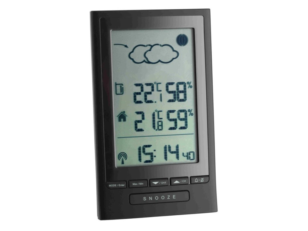Digitální meteostanice, bezdrátový přenos z čidla (součástí balení) na max. vzdálenost 70 m, zobrazuje vnitřní a venkovní teplotu/vlhkost, čas, symbolovou předpověď počasí, tendenci vývoje tlaku, měsíční fázi, DCF hodiny
