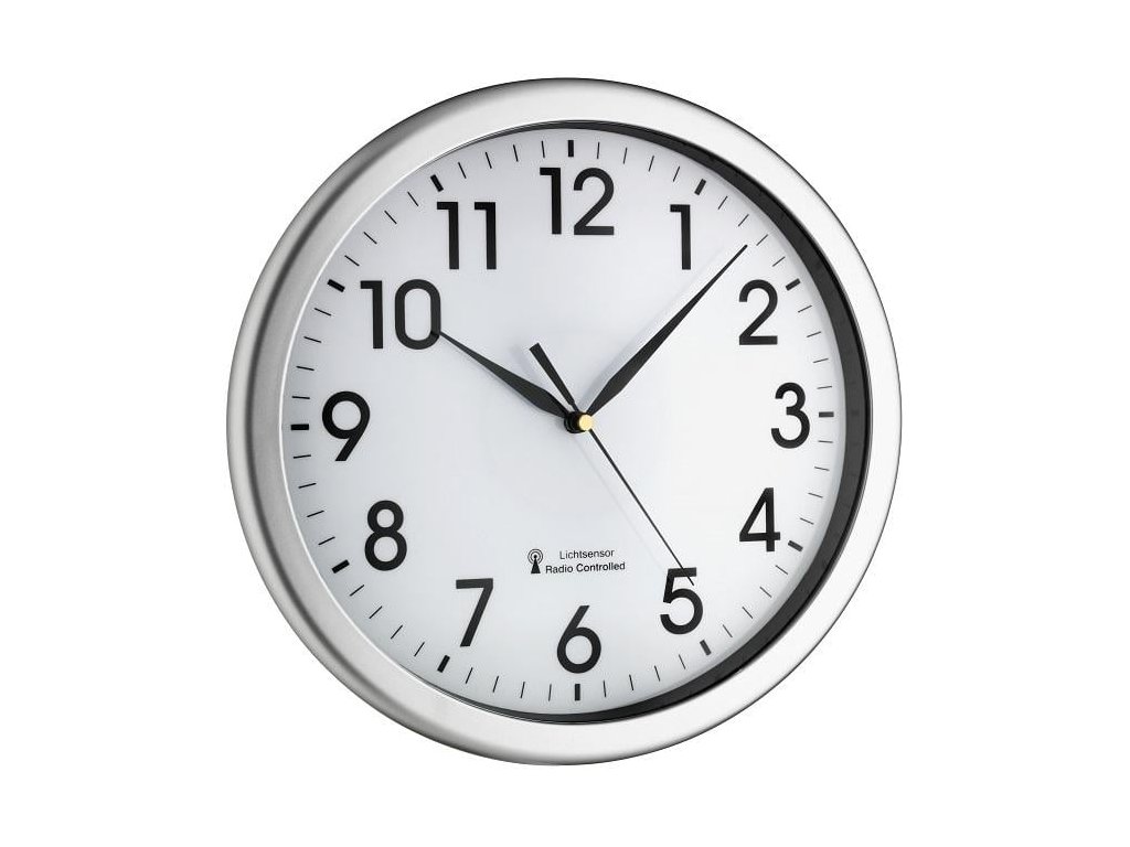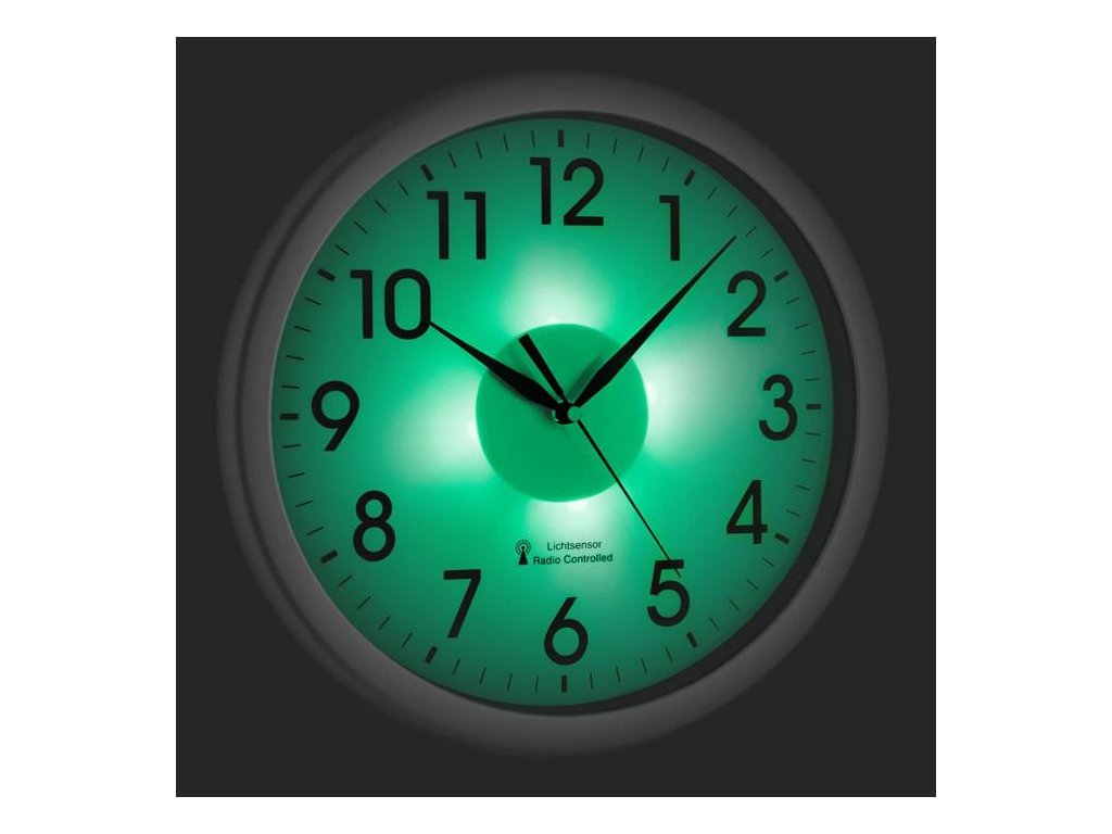 Nástěnné hodiny řízené DCF signálem se snadno čitelným ciferníkem s velkými číslicemi, tichý chod, sekundová ručička, zelené LED osvětlení (na baterie či AC adaptér) – podsvícení může být trvalé a nebo automaticky aktivováno pomocí světelného senzoru