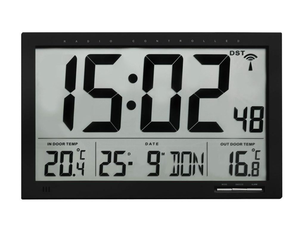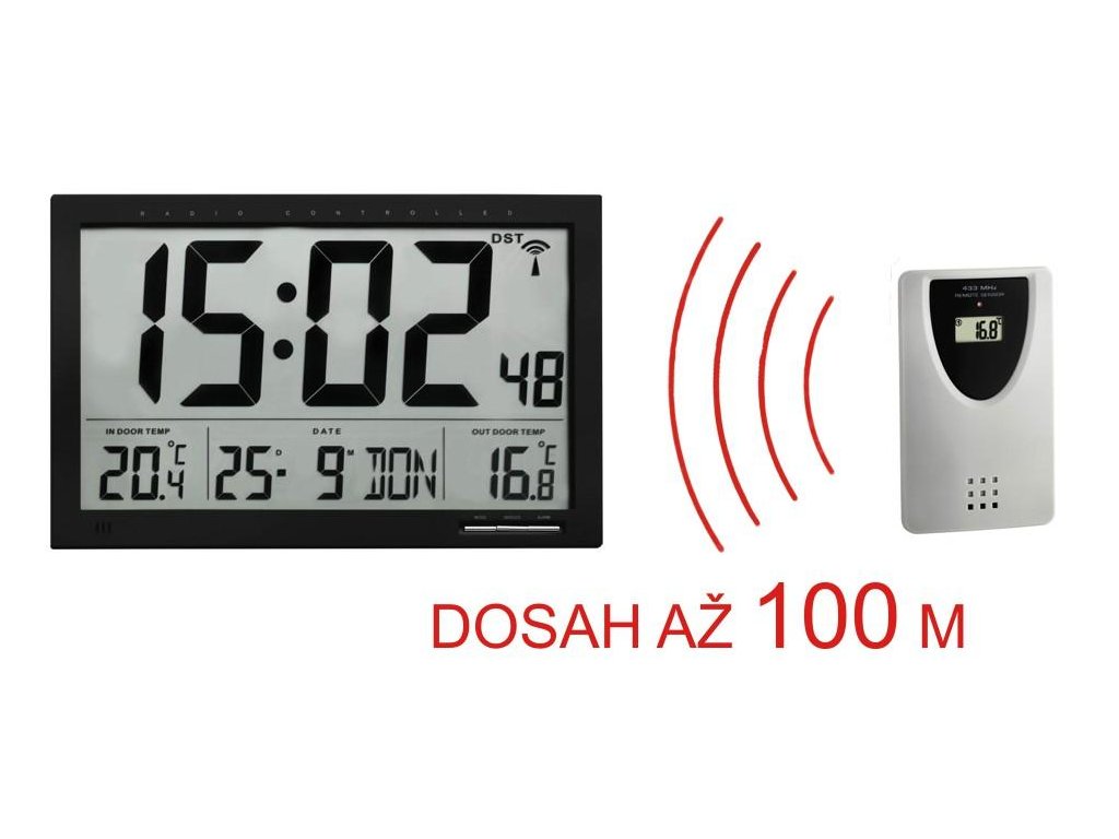 Digitální nástěnné hodiny - vysoce přesné rádiem řízené hodiny, bezdrátový senzor teploty s dosahem až 100 m (volné prostranství), vnitřní teplota, budík s funkcí opakovaného buzení, kalendář s názvem dne v osmi jazycích., teplotní alarm