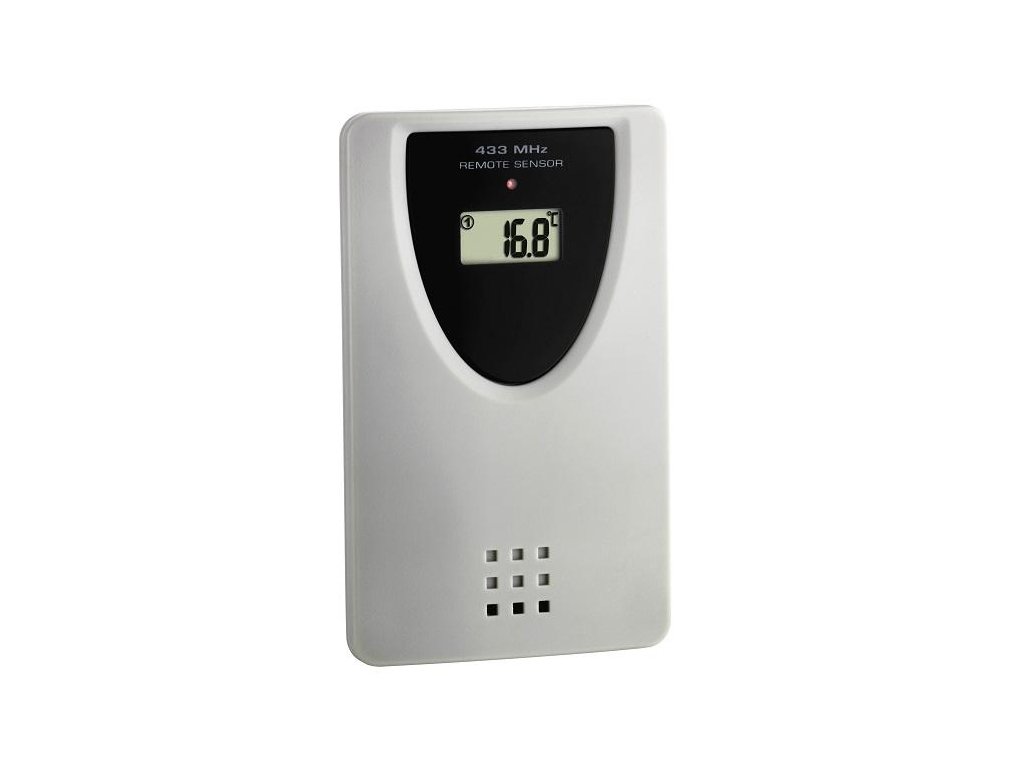 Nástěnné hodiny s vnitřní a vnější teplotou TFA 60.4510.01 jsou vhodné do každé kanceláře či do větších prostorů. Velký a přehledný LCD displej o rozměrech 330 x 180 mm zobrazuje velkými číslicemi čas a datum. Kromě toho jsou hodiny vybaveny vnitřním teploměrem a součástí balení je i jedno bezdrátové čidlo na měření teploty. Dosah bezdrátového čidla je ve volném prostranství až 100 m. Hodiny a datum jsou řízeny DCF signálem. Na hodinách lze nastavit hodní a dolní alarm venkovní teploty. Přístroj je možné zavěsit na stěnu nebo umístit na vodorovnou podložku neboť je vybaven stojánkem. Vlastnosti: Vysoce přesné rádiem řízené hodiny. Bezdrátový senzor teploty s dosahem až 100 m (volné prostranství). Vnitřní teplota. Budík s funkcí opakovaného buzení. Kalendář s názvem dne v osmi jazycích. Teplotní alarm. Ideální pro použití v domácnosti, kanceláři, čekárně, lobby či vstupní hale a také jako dárek. Možnost zavěšení či postavení na podložku. Technické informace: Příslušenství: český návod Barevné provedení: černé Rozsah měření vnitřní teploty: 0 °C - +50 °C Rozsah měření venkovní teploty: -20 °C - +50 °C Frekvence přenosu: 433 MHz Max. dosah: až 100 m (volné prostranství) Interval přenosu: cca 64 s. Tolerance senzoru teploty: +/- 1 °C Napájení hodiny: 4x 1,5V AA (jsou součástí balení) Napájení čidlo: 2x 1,5 AAA (jsou v balení) Rozměry hodin: 367 x 28 (86) x 235 mm Rozměry displeje stanice: 330 x 180 mm Rozměry čidla: 62 x 24 (35) x 101 mm Hmotnost hodin: 882 g (bez baterií) Hmotnost čidla: 63 g (bez baterií)