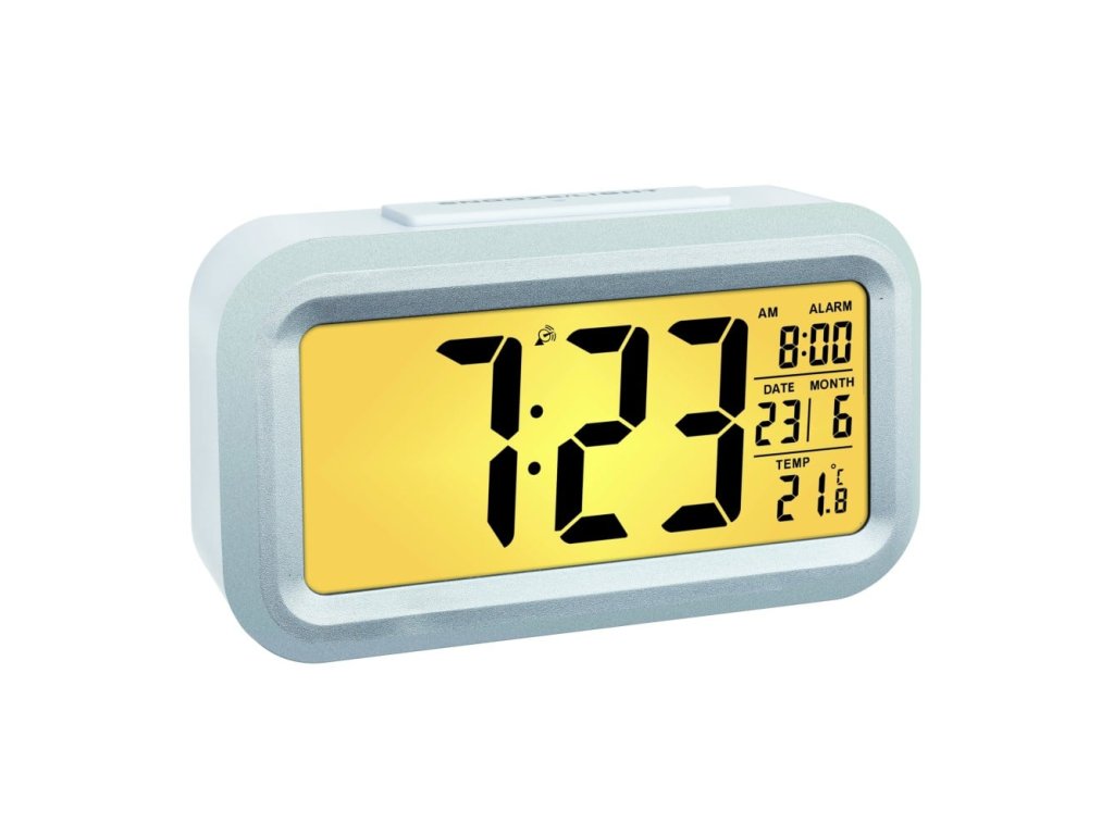Digitální budík s velkou LCD obrazovkou a s funkcí zobrazení data a vnitřní teploty. Funkce a vlastnosti: Rádiem řízený čas a datum Budík s funkcí opakovaného buzení (Snooze) Zesilující a zrychlující vyzvánění buzení Možnost podsvětlení displeje (5 sekund) Funkce měření vnitřní teploty Nastavení zobrazení formátu času (12h/24h) Funkce světelného senzoru, který aktivuje podsvícení displeje v závislosti na intenzitě osvětlení. Ovládací panel na zadní straně budíku Přepínání jednotek měření teploty °C/°F Technické informace: Rozměry: 138 x 48 x 79 mm Rozsah měření teploty: -9°C... + 50°C Hmotnost: 147 g Napájení: Baterie 3 x 1,5 V AAA (nejsou součástí balení) Barva: bílá