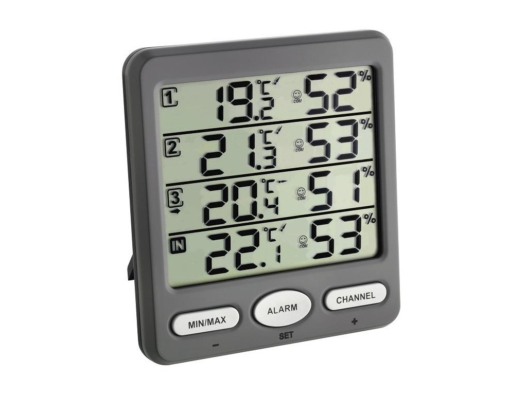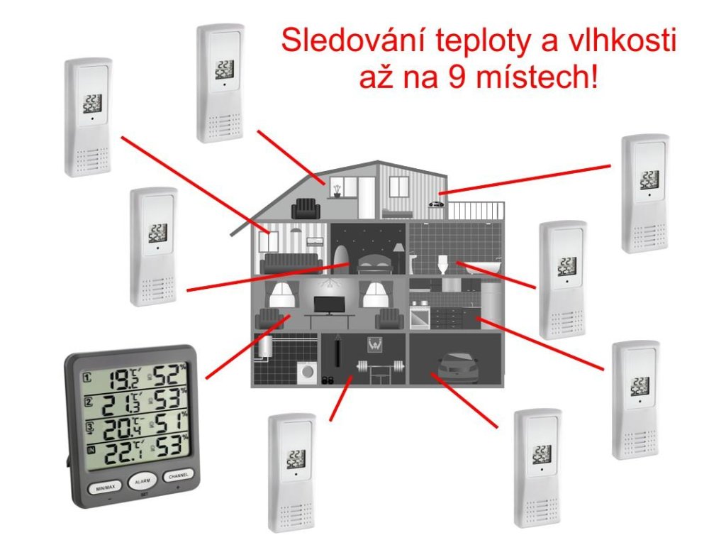 Bezdrátový teploměr s vlhkoměrem ke kontrole vnitřního a venkovního klimatu pomocí vnitřního senzoru a 3 bezkabelových senzorů (max. 100 m) až ve 4 místnostech, možnost rozšíření na 8 senzorů, funkce Min.-Max., komfortní zóny, tendence teploty