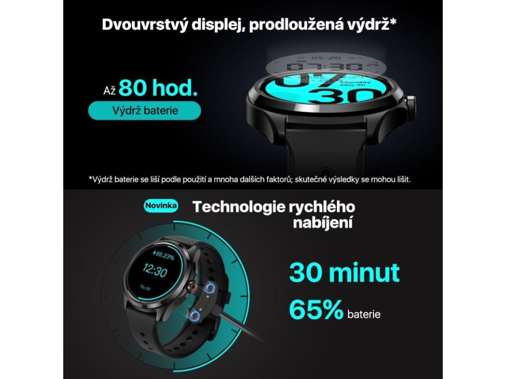 Technologie Dual Display od společnosti Mobvoi používá dva displeje. Základem je skvělý AMOLED displej, nad ním je druhý úsporný displej. To umožňuje plynulé přepínání mezi základním a chytrým režimem a díky tomu hodinky poskytují výrazně delší výdrž na baterii.