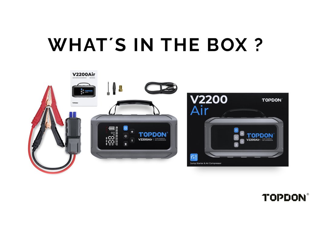 Představujeme V2200air, špičkové multifunkční zařízení pro každého řidiče. S tímto všestranným pomocníkem snadno nastartujete vůz, nafouknete pneumatiky, nabijete elektroniku a osvětlíte okolí. Díky špičkovému startovacímu proudu 2200 A zvládne během 2 sekund nastartovat motory až o objemu 8.0 l (benzín) nebo 6.0 l (diesel). Integrovaný vzduchový kompresor zvládne pneumatiky nafouknout za méně než 3 minuty. S V2200air jste připraveni na každou situaci, ať vás potká cokoli.