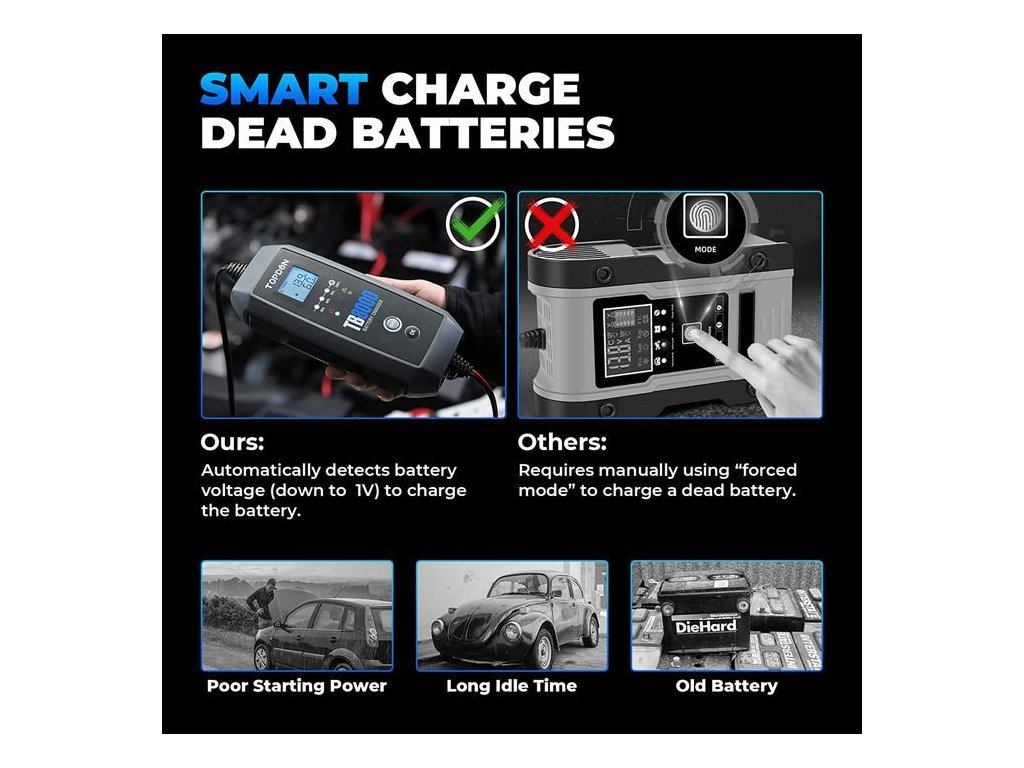 9stupňový systém inteligentního nabíjení TB8000 poskytuje uživatelům špičkovou technologii, která automaticky identifikuje stav baterie a dodává nejvhodnější proud. S tímto zařízením se již nemusíte obávat poškození baterií!