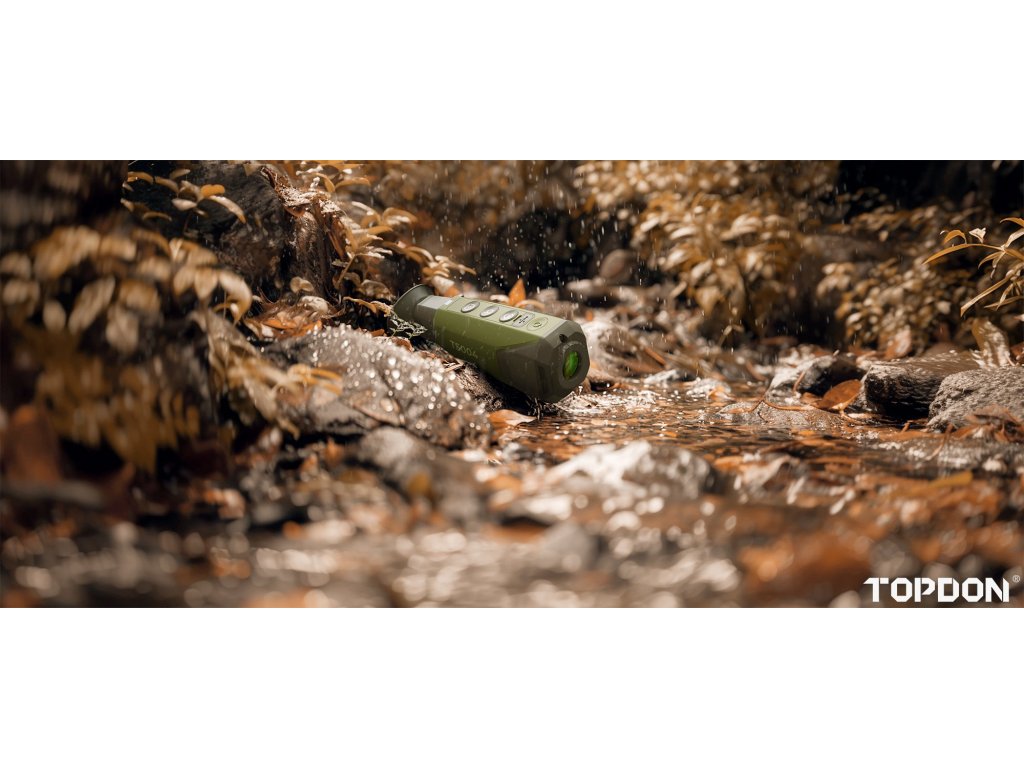 TS004 termovizní monokulár, detekční dosah 410 m, infračervené rozlišení 256x192, výdrž baterie 11 hodin (5000 mAh), obnovovací frekvence 50 Hz, ochrana IP67, 8x digitální zoom, vestavěná paměť 32 GB, bezdrátové připojení (Top Infrared App)