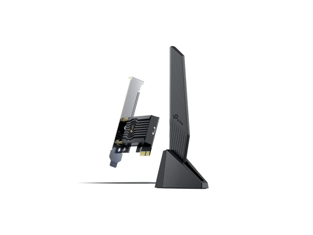 Wi-Fi 6E PCIe adaptér s třípásmovou rychlostí až 2402 Mb/s (6 GHz), 2402 Mb/s (5 GHz) a 574 Mb/s (2,4 GHz), Bluetooth 5.3, WPA3 zabezpečení a rozšířeným pásmem 6 GHz, všesměrová anténa s magnetickou základnou