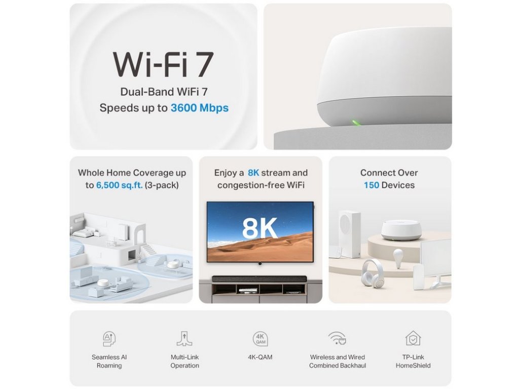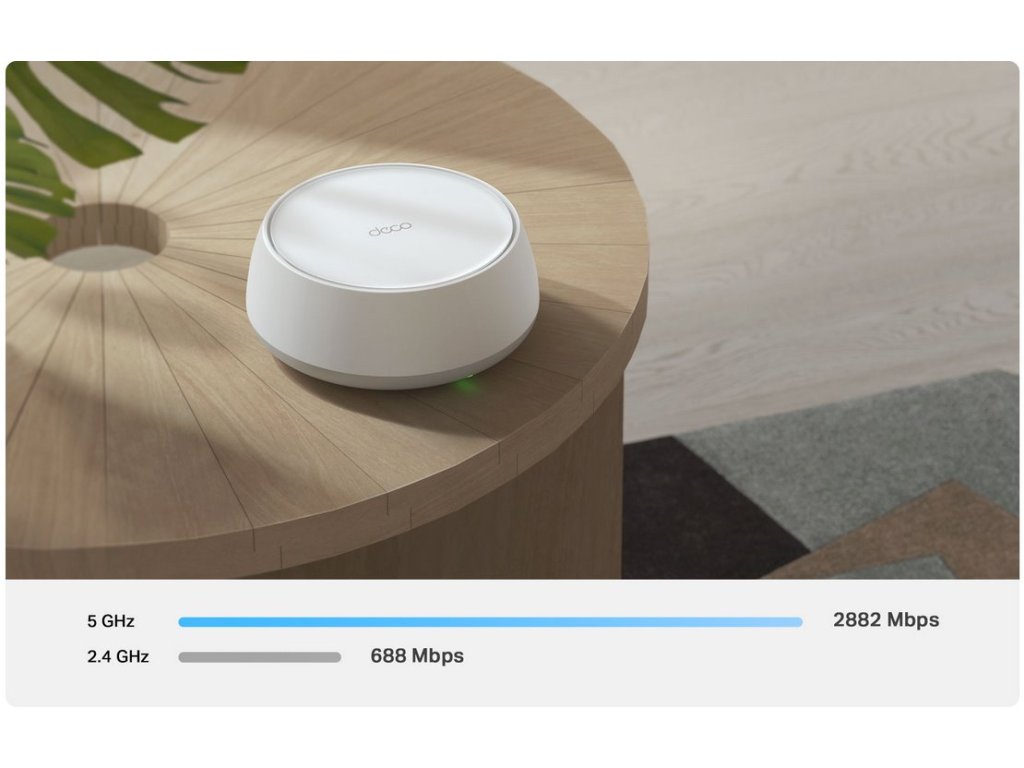 TP-Link Deco Wi-Fi 7 Mesh: Dual Band 2,4/5?GHz až 2 882+688 Mbps, 2×2 MU-MIMO, inteligentní MLO, WPA3, Gigabit LAN, snadné nastavení a bezproblémový roaming.