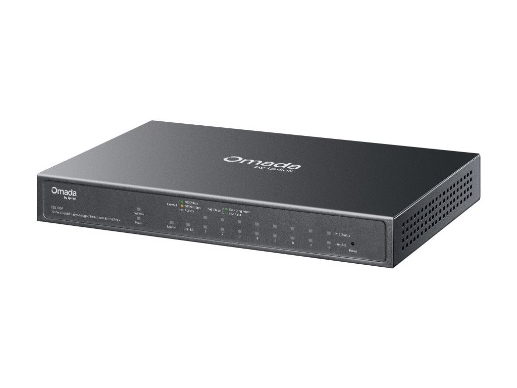 Omada 10portový gigabitový easy managed switch nabízí 9× 10/100/1000 Mb/s RJ45 portů, z toho 8 portů s podporou PoE+, které umožňují napájet připojená zařízení přímo přes síťový kabel. Kombinovaný gigabitový SFP/RJ45 port rozšiřuje možnosti připojení a poskytuje flexibilitu pro různé topologie sítě. S napájecím rozpočtem 63 W a možností dodat až 30 W na každý PoE port je switch ideální pro bezpečnostní kamery, přístupové body i další síťová zařízení.