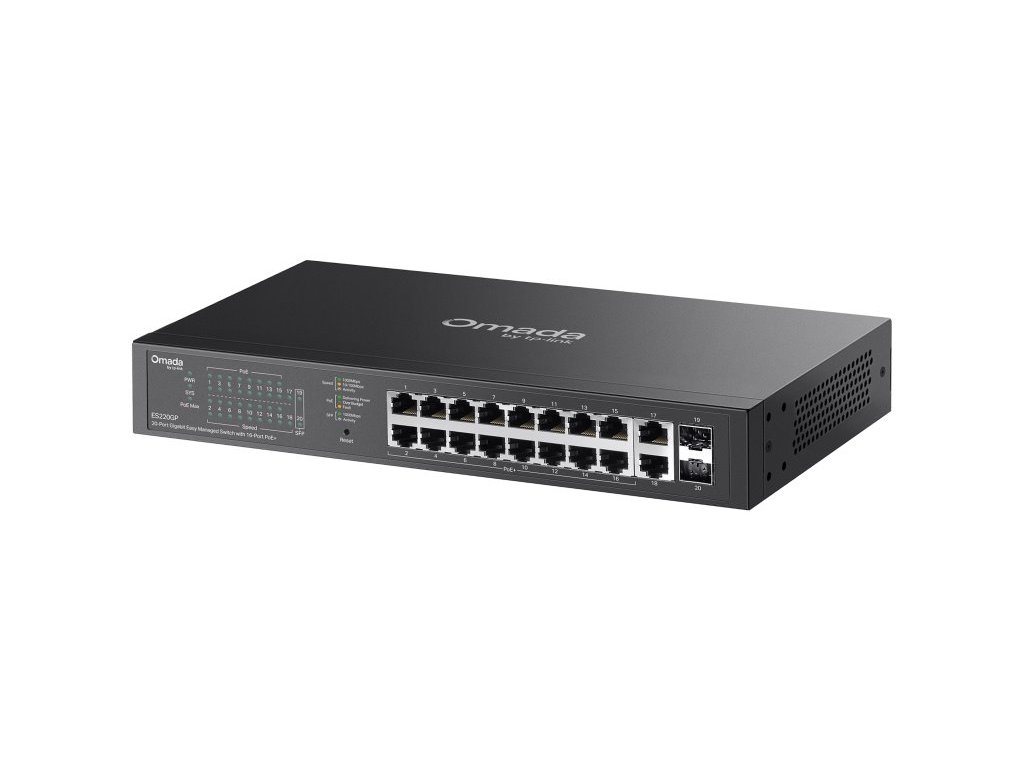 20portový gigabitový switch Omada, 16× PoE+ (150?W), 2× SFP, plug & play, cloud správa, QoS/VLAN, PoE až 250?m, kovové pouzdro.