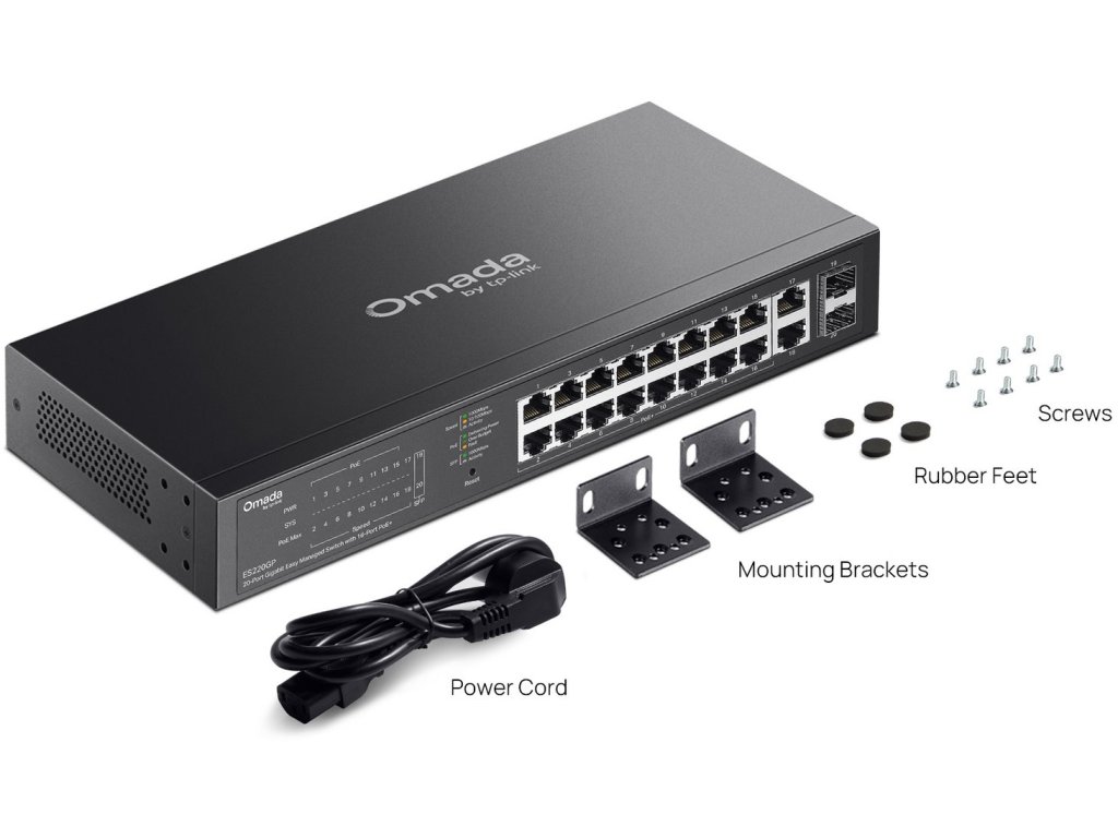 Zajistěte spolehlivé a rychlé připojení s 20portovým gigabitovým Easy Managed Switchem, který nabízí 18× RJ45 portů, z toho 16× s podporou PoE+ podle standardů 802.3af/at. S napájecím budgetem 150 W a až 30 W na každý port poskytuje dostatek energie pro napájení IP kamer, přístupových bodů či VoIP telefonů. Dva gigabitové SFP porty umožňují flexibilní připojení optických linek a zajišťují vysokorychlostní přenos dat bez omezení.